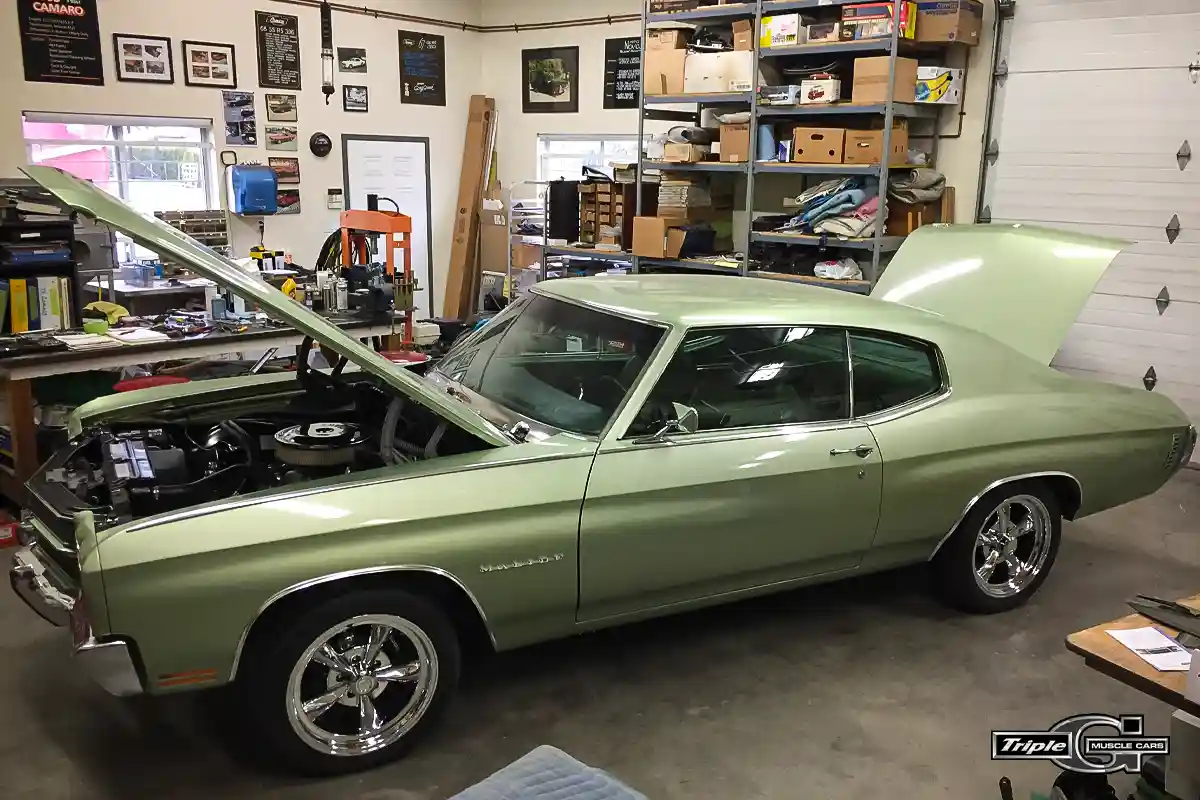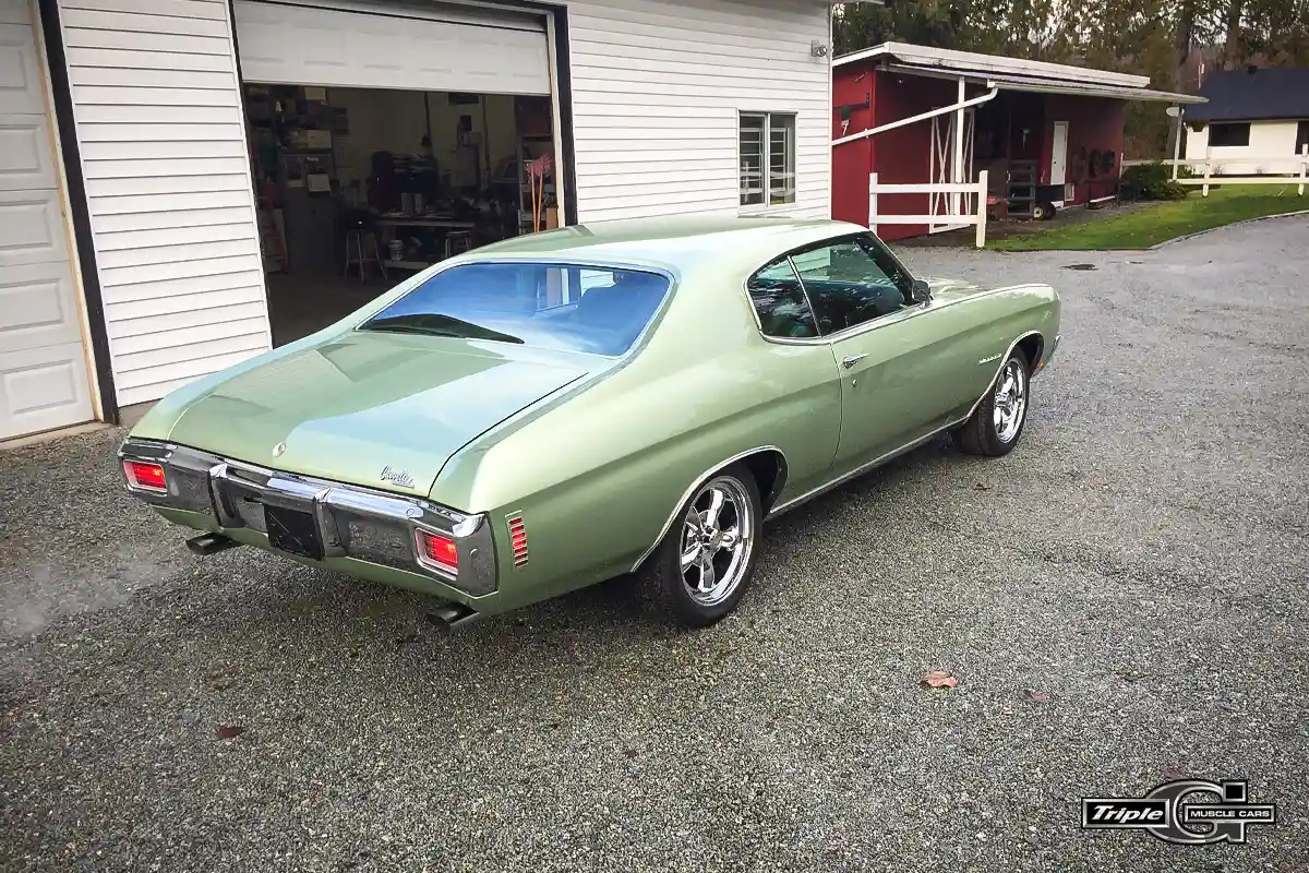 This 1970 Chevelle Malibu began life as a six-cylinder car and was upgraded to a 350 engine during a complete frame-off restoration. Finished in beautiful Mist Green, the car blends classic style with a touch of added performance while maintaining its original character.